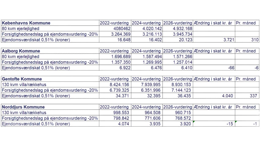 Vi har ikke adgang til Danmarks Statistiks datagrundlag, men for at få en indikation, har vi fremskrevet 2024-vurderingerne (altså de indekserede 2022-vurderinger) på baggrund af Boligsidens markedsindeks, (da disse er tilgængelige frem til januar 2026) og beregnet, hvor meget skatten vil ændre sig for hhv. en lejlighedsejer i København og i Aalborg.